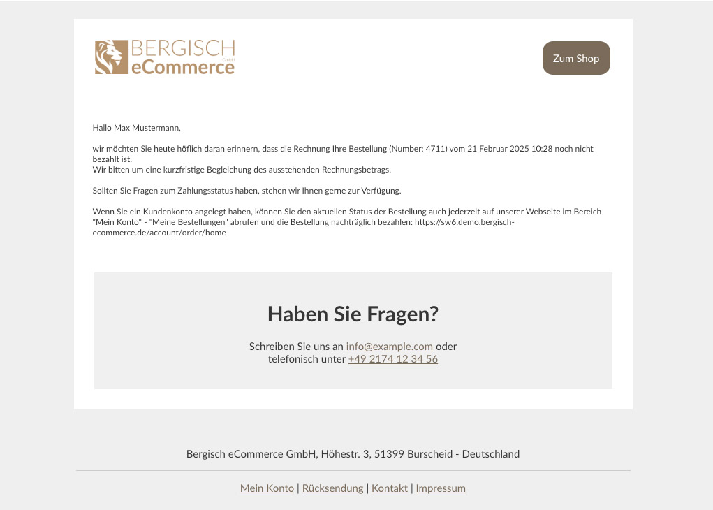 Mit diesem Plugin versendest du automatisch Zahlungserinnerungen per Mail. So sorgst du für mehr bezahlte Vorkasse-Bestellungen und eine bessere Zahlungsmodalität Ihrer Kunden.