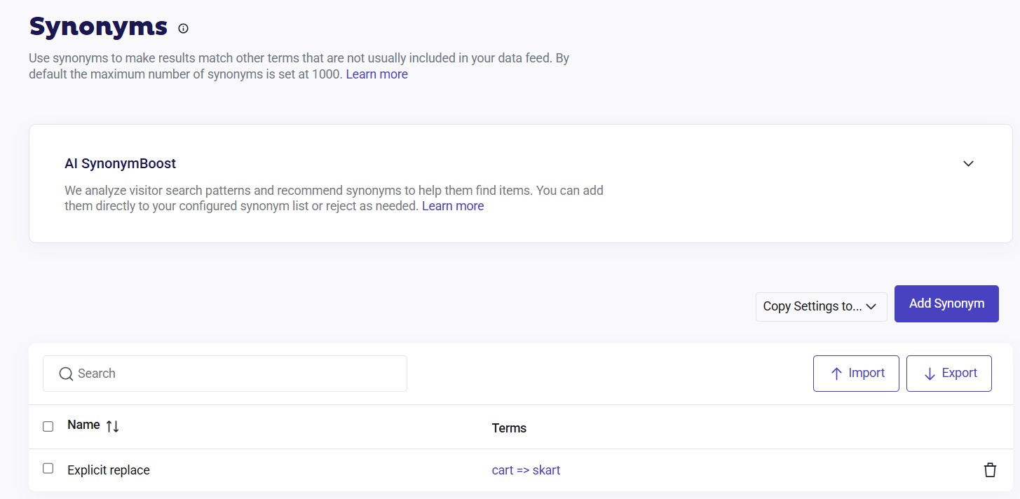 Mit Synonymen in DooFinder kannst du deine Suchergebnisse gezielt verbessern. Du kannst Begriffe miteinander verknüpfen, damit auch Suchanfragen zu Ergebnissen führen, die in deinem Datenfeed eigentlich nicht direkt zusammengehören. Im DooFinder-Admin-Panel legst du einfach deine gewünschten Synonyme fest und bestimmst, welche Begriffe bei der Suche miteinander abgeglichen werden sollen. So stellst du sicher, dass deine Kunden immer die passenden Produkte finden – auch wenn sie andere Begriffe verwenden.