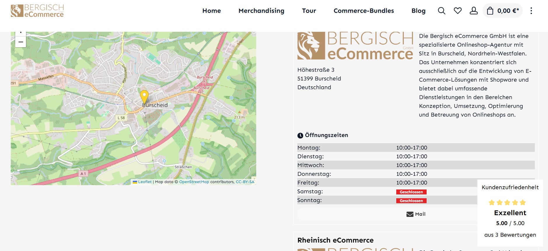 Mit der Händlersuche können individuelle Händlerprofile erstellt werden. Das Plugin ermöglicht es Händler, Verkaufsfilialen und weitere Standorte einfach in einer Erlebniswelt darzustellen. Es besteht die Möglichkeit, zusätzlich eine eigene CMS Seite anzuzeigen.