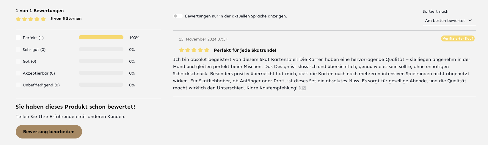 Kunden können sich auf die Erfahrungen anderer verlassen, um die Qualität und Funktionalität eines Produkts besser einzuschätzen. Zudem können Produktbewertungen die Sichtbarkeit in Suchmaschinen erhöhen, da sie oft relevante Keywords enthalten und sich der Content häufiger ändert.